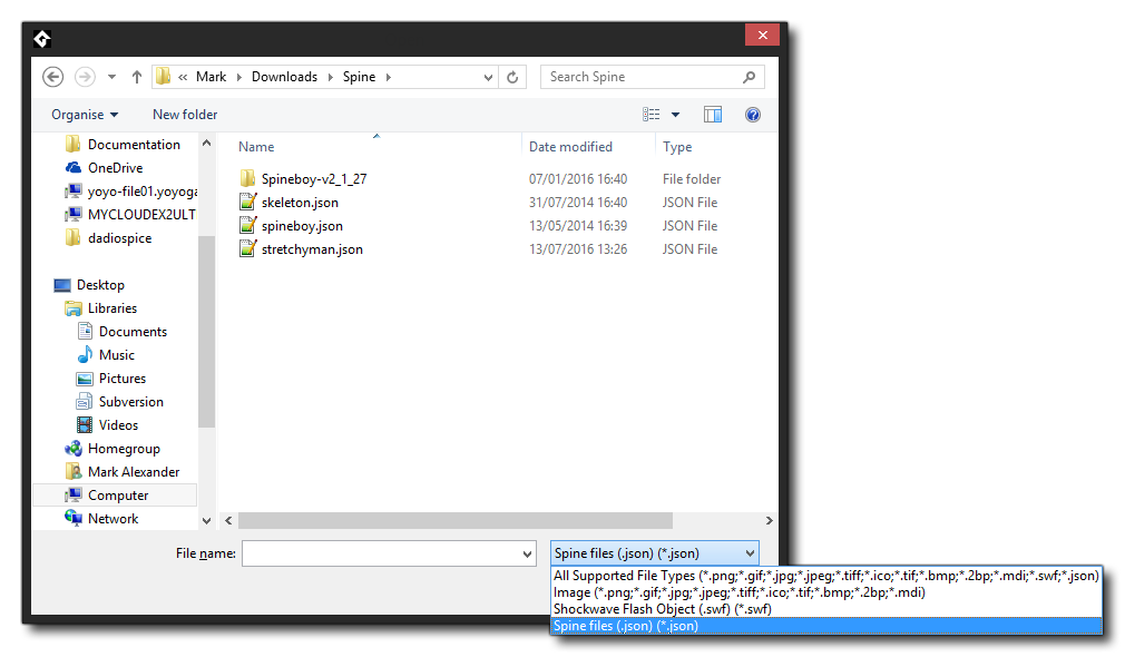 Currently GameMaker Studio 2 can only import vector images from JSON format files made by the program Spine, however the way to import them into the program is almost identical to that for adding a normal bitmap image. To add a skeletal animation, you need to create a new sprite, which will bring up the standard Load Sprite dialogue, but make sure that you have selected *.json from the file filter at the bottom.