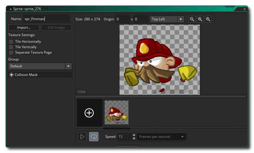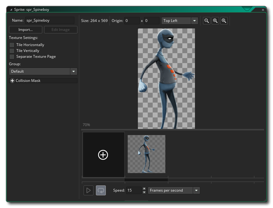 NOTE: Due to the complexity of skeletal animations, the preview image shown in the sprite editor is not intended to accurately represent your animation, but rather give you a simple image that represents the animation for visualising in the room editor.