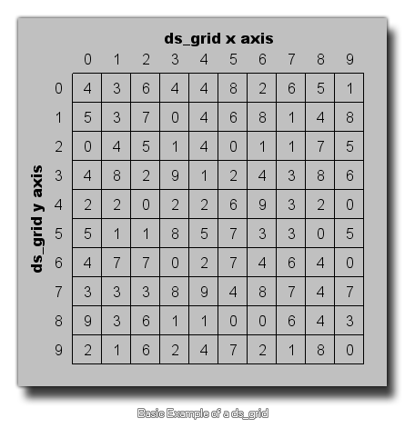 This type of structure allows you to set and retrieve the value of cells in the grid by giving the x and y index of it (which starts with 0 for both the x and the y axis and goes up to the width - 1 and the height -1). But you can also set the value in specific grid regions, add single values, and retrieve the sum, maximum, minimum, and mean value over a given region, making this data structure the most versatile of all those available to you.